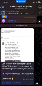 The attached pic includes screenshots of Harvey’s recent rantings on telegram and suggest Harvey isn’t best pleased that we have brought his appalling activities to wider scrutiny. Activities which can be seen in this video here https://www.facebook.com/FRWWales/videos/1207390309892071 (harvey appears 1 min 27 seconds in) and which have included promoting holocaust denial, white supremacism, peddling anti-semitic conspiracy tropes and likening people in Cardiff of somalian origins to apes.